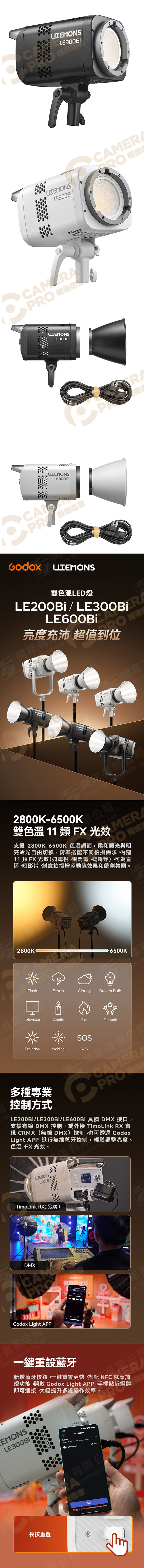 具備DMX接口,支援有線DMX控制,或外接TimoLink RX實現CRMX控制,也可藍牙連接Godox Light App控光