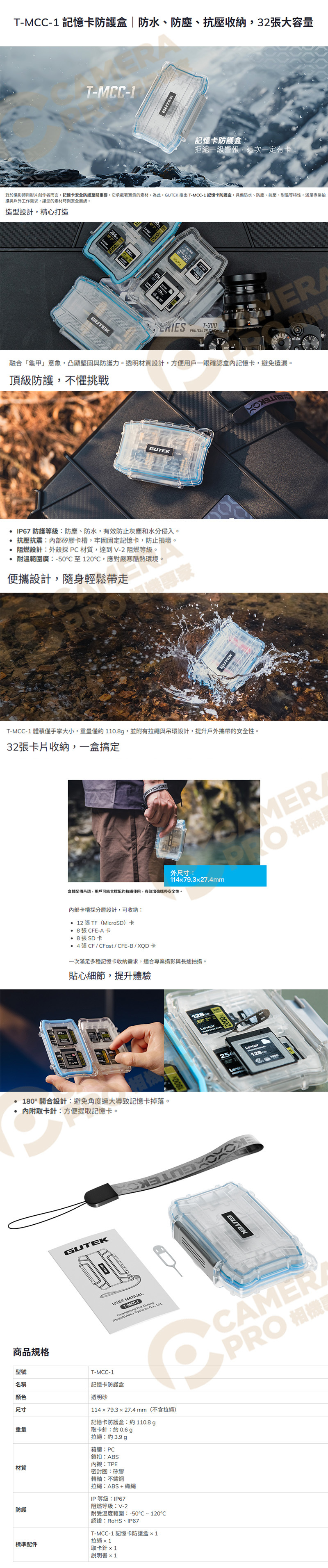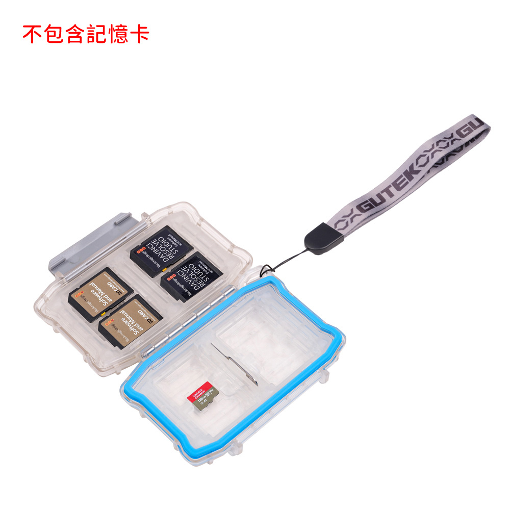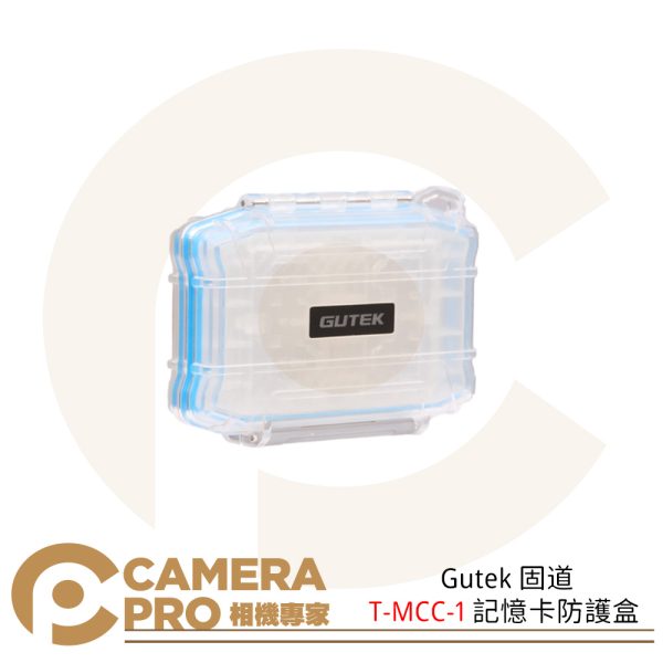 GUTEK T-MCC-1 防水記憶卡盒,具備防水、防塵、抗壓、耐溫特性,提供全方位資料防護。支援 SD、microSD、CF、CFexpress 多卡位收納。半透明外殼設計,輕便耐用、抗衝擊,適合攝影師與影片創作者於戶外拍攝與長途工作攜帶。