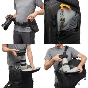 背包後門內側設有拉鍊透明收納袋,上方是CradleFit 筆記型電腦隔層,可容納最大16 吋的 MacBook Pro。側門外側設有大型彈性口袋,可容納 1 公升水瓶,底部加固,可支撐三腳架。側邊頂部的額外環扣和口袋方便快速取用物品,並可牢固地固定三腳架。背包可自行直立,方便您輕鬆搬運取用裝備。 SlipLock