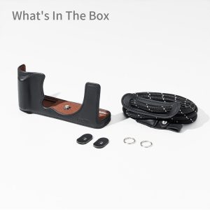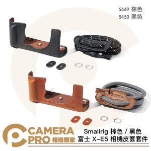 SmallRig斯莫格相機皮套套件(適用於富士X-E5) (棕色)5449、(黑色)5450是為保護相機,提升相機復古感與質感而設計。套裝包含:半包皮套,肩帶。半包皮套採用耐磨透氣的頭層真皮材質,耐磨透氣,增強機身復古韻味和質感;手握處內置泡棉手握,增加手指抓握力;內部均採用絨面內裡,保護相機防止刮傷;半包皮套通過底部一顆1/4”-20手擰螺絲與相機安裝,無需額外安裝工具;不遮擋機身接口及按鍵:電池倉、對焦環、卡槽、藍牙按鍵等;內建航空鋁合金骨架,不僅能保障貼合度,亦能保護相機,防止磕碰觸。螺紋,無需拆卸半包皮套,即可直接安裝至三腳架;附贈復古編織真皮肩帶,方便攜帶相機。