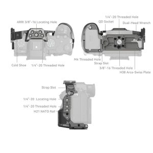 SmallRig斯莫格拓展框(適用於SonyAlpha 1 II / Alpha 9 III) 5187是為提供配件拓展介面、保護機身而設計。自研快拆專利結構(命名為迅鷹)涵蓋滑條和阿卡,與迅鷹生態配件(如:側手柄4485、快拆底座4486、上手提4483)搭配使用實現穩固無虛位,一鍵自鎖,流暢滑入,提高拆裝效率。拓展框通過底部和側面的1/4”-20螺絲以及底部M4定位柱三點鎖定相機,無需拆肩帶環,穩固不偏轉。內建全方位保護墊片,防止相機刮傷。電池倉位置增加開合扳手設計,更貼合機身曲線,解決小指放置問題增強機身握感。拓展框內建1/4”-20孔、阿萊定位孔、迅鷹滑條,可拓展手柄,如上手提3765、4757,側手柄4755等進行手持拍攝,輔助運鏡,增加拍攝畫面穩定性;內置冷靴接口,可安裝DJI MIC II麥克風、補光燈等設備設備,增加拍攝畫面穩定性;內置冷靴接口,可安裝DJI MIC II麥克風、補光燈等設備設備;快裝板,輔助相機搭配穩定器拍攝;內建阿卡快裝板,可相容於阿卡三腳架及DJI RS 2 / RSC 2 / RS 3 / RS 3 Pro / RS 4 / RS 4 Pro穩定器,實現手持、穩定器、三腳架拍攝場景切換;內建QD孔可相容於QD肩帶;內建磁光板,方便裝置、三腳架拍攝場景切換;
