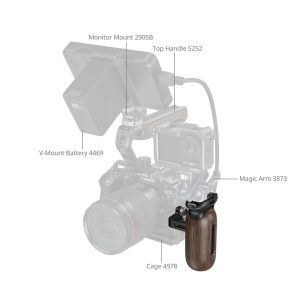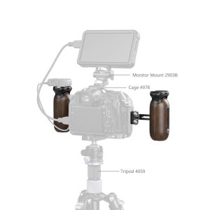 SmallRig斯莫格木頭側手柄(螺紋)5237是為提供舒適的手持拍攝而設計,透過2個1/4”-20手擰螺絲鎖緊在任何側面帶有間距為18mm的兩個1/4”-20螺紋孔的拓展框、拓展板上。木頭手握結合內部一體式鋁合金,穩固耐用,握感符合人體工學,握感舒適。可拆開鋁合金連接部分更換把手方向,用於拓展框左右兩側。整體外觀採用膠囊造型,穩中有型。手把頂部內建1個冷靴,可安裝麥克風和閃光燈,1個1/4”-20定位孔可用來外接魔術手、監視器支架(如:4886),用於轉接監視器。並可透過鬆脫側面螺絲上下調節,調整範圍28mm,可調節設備重心以致最佳握持位置。