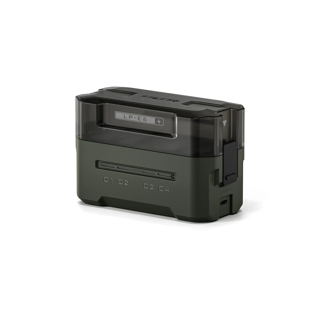 這款緊湊型充電盒專為支援佳能和第三方 LP-E6 電池而設計,提供四個插槽,方便充電和存放。